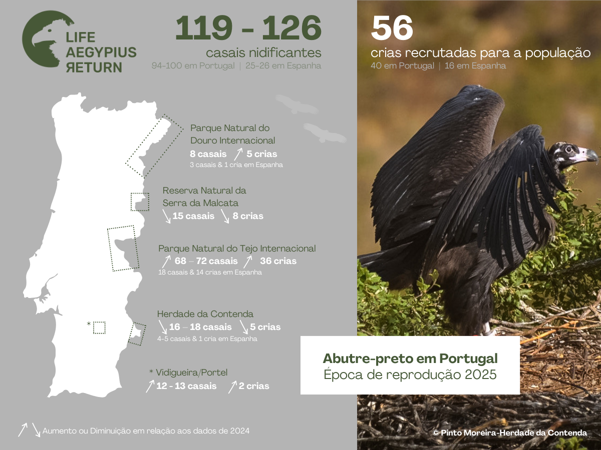Os números recentes ilustram uma recuperação impressionante, sobretudo a partir de 2022, ano em que arrancou o projeto LIFE Aegypius Return. Nesse ano, estimava-se a existência de apenas 40 casais reprodutores, distribuídos por quatro colónias: Douro Internacional, Serra da Malcata, Tejo Internacional e Herdade da Contenda (Baixo Alentejo).