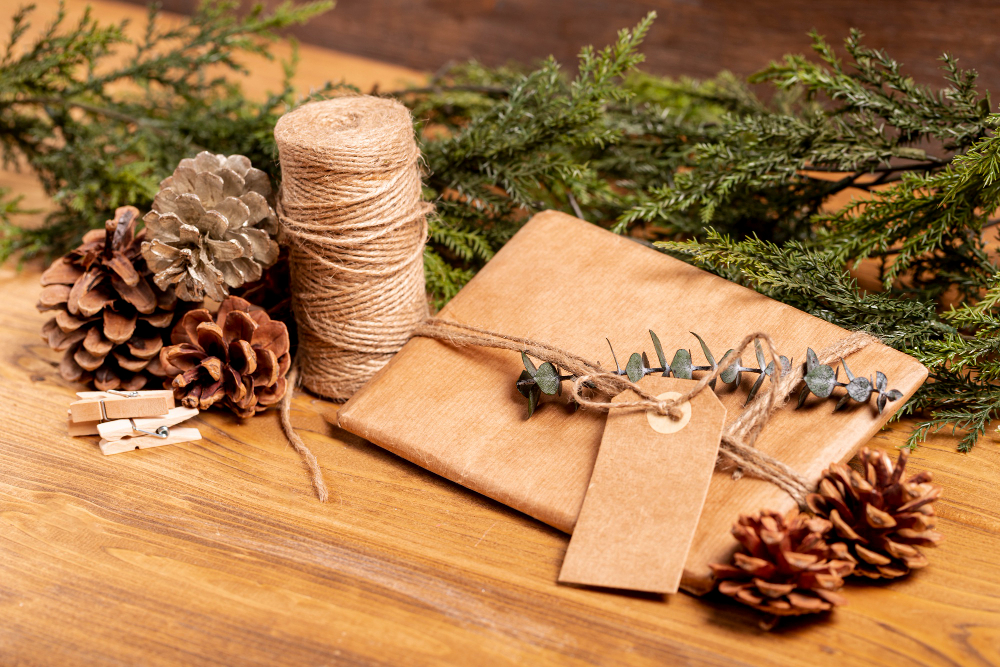 Embrulhos criativos: Em vez de comprar papel de embrulho novo, podemos usar jornais, revistas, mapas antigos, sacos de papel pardo decorados à mão ou até tecidos reutilizados. O resultado pode ser muito mais original e personalizado do que o papel comercial.